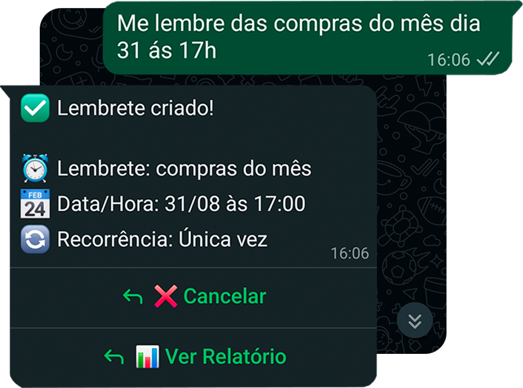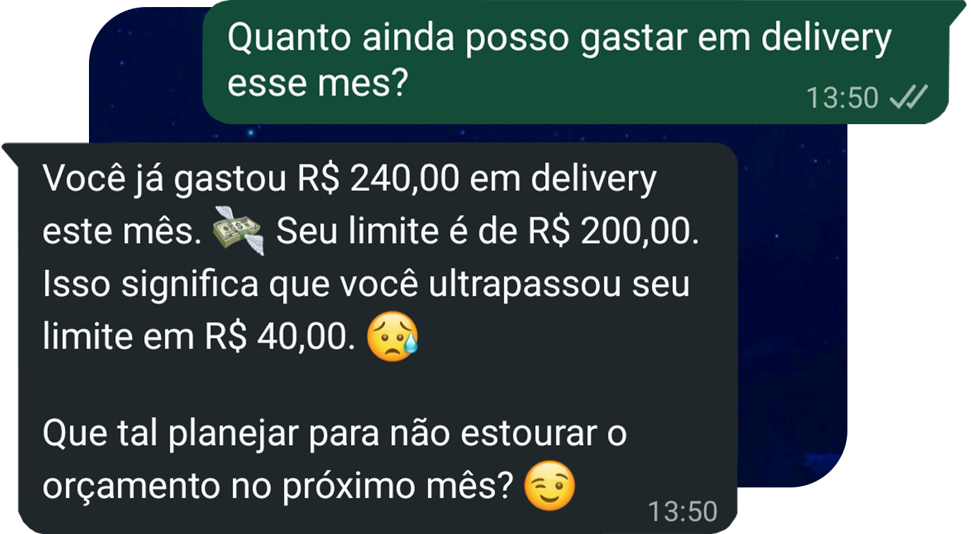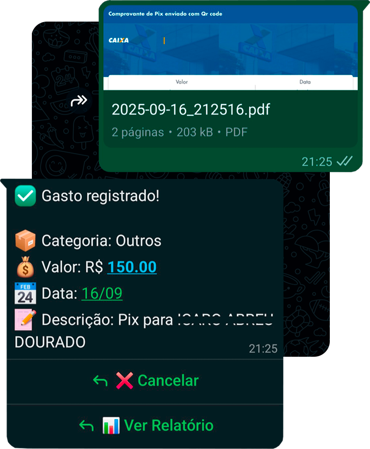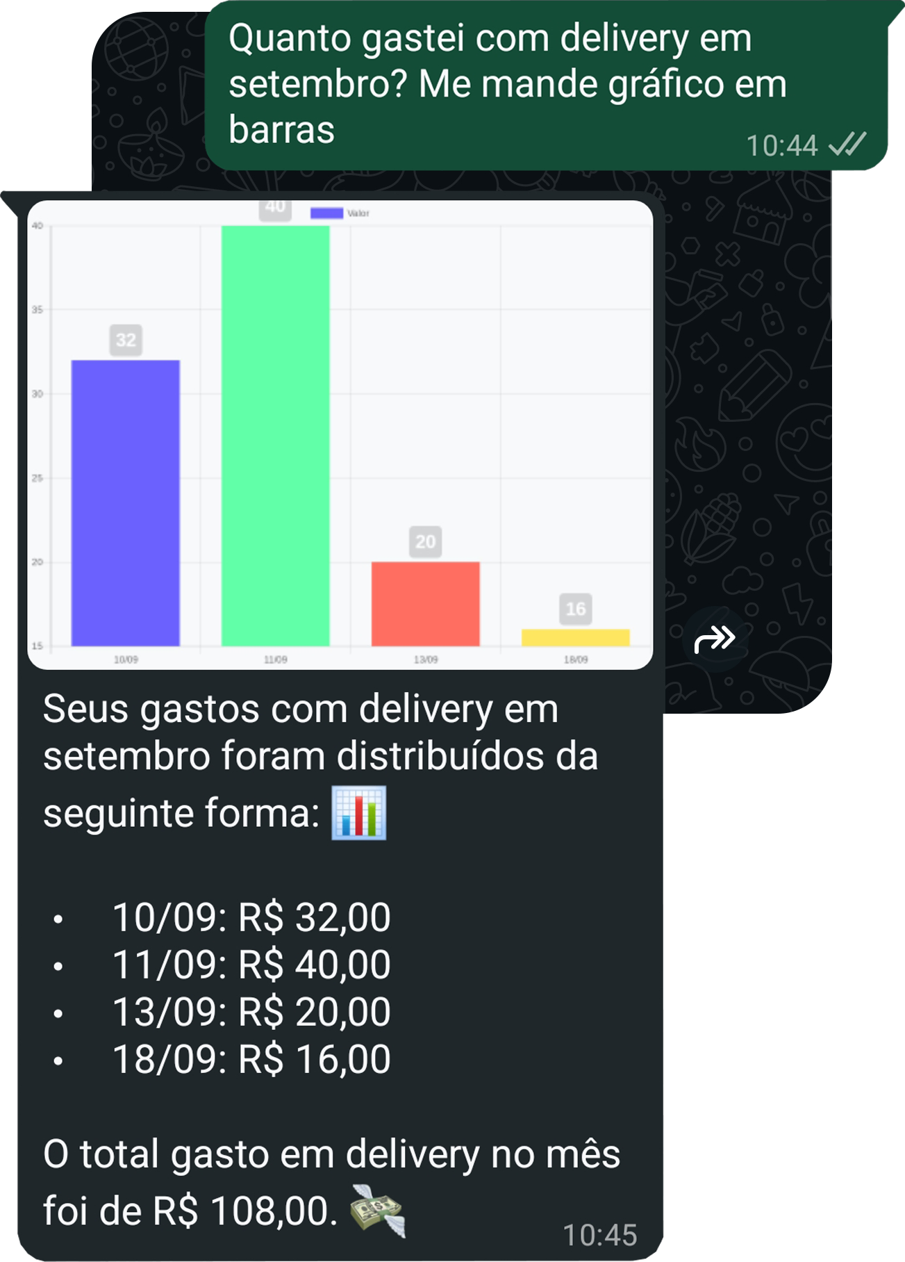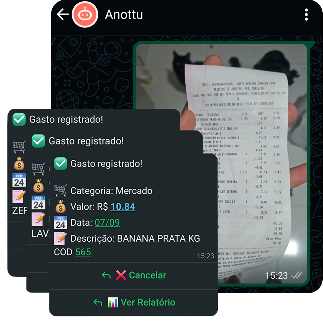 Texto, áudio, foto, extratos e planilhas pelo WhatsApp.